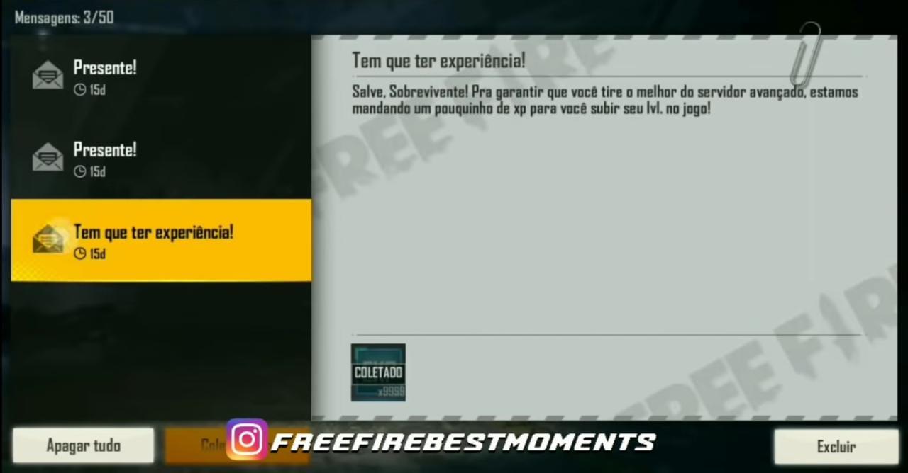 Um novo design foi adicionado a caixa de correio tendo um fundo branco com o nome Free Fire entre outras coisas, o seu correio é como se fosse um e-mail, por lá você recebe mensagens, prêmios e inclusive seu codiguin resgatado.