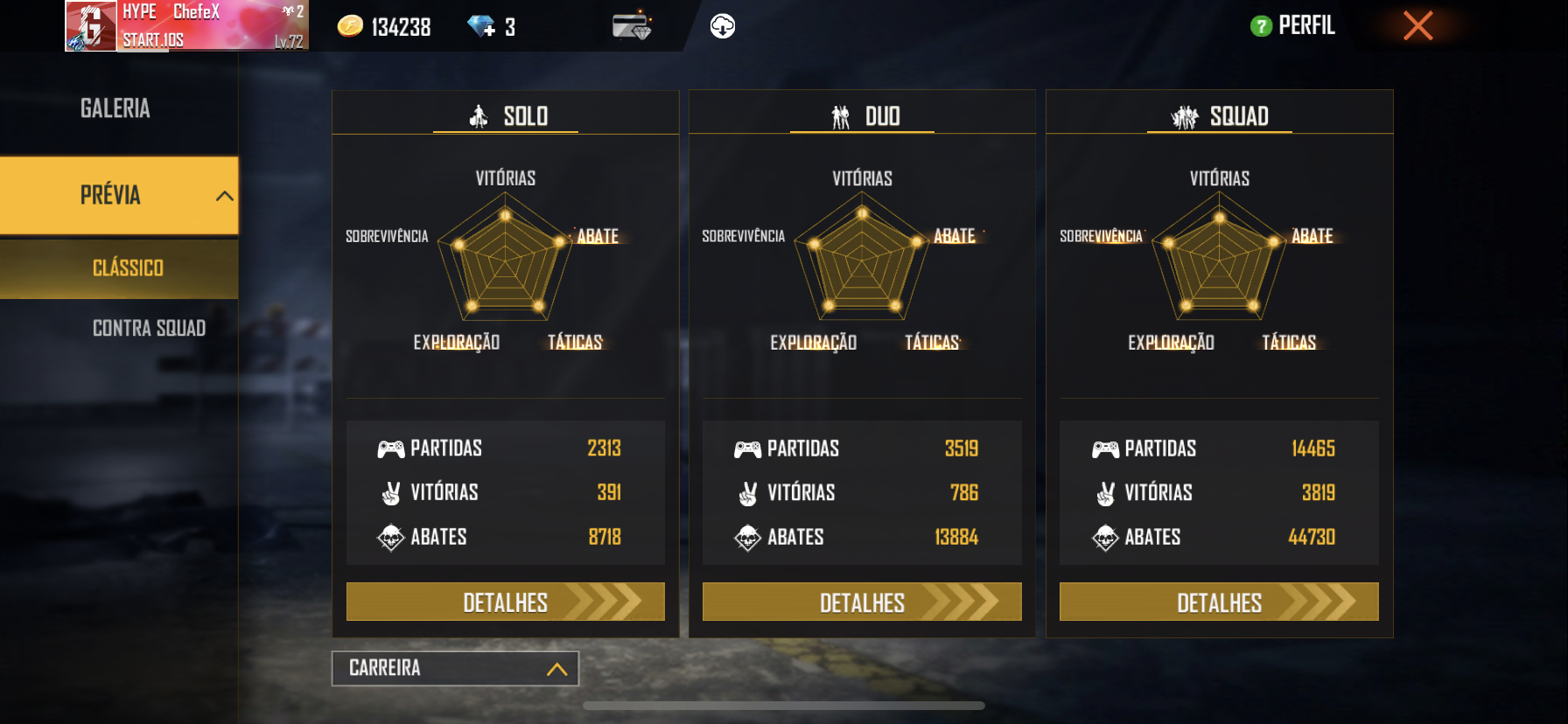 SOLO, participou de 2313 jogos e tem 391 vitórias em seu nome, mantendo uma taxa de vitórias em 17%. Juntamente com 8718 abates, mantendo uma taxa KD em 4,54.